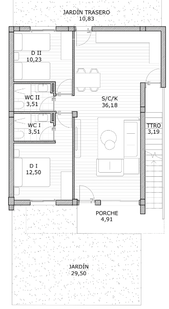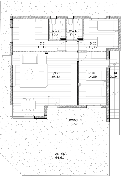Lägenhet med trädgård. 2 sovrum, 2 bad. Trädgård 30m2.