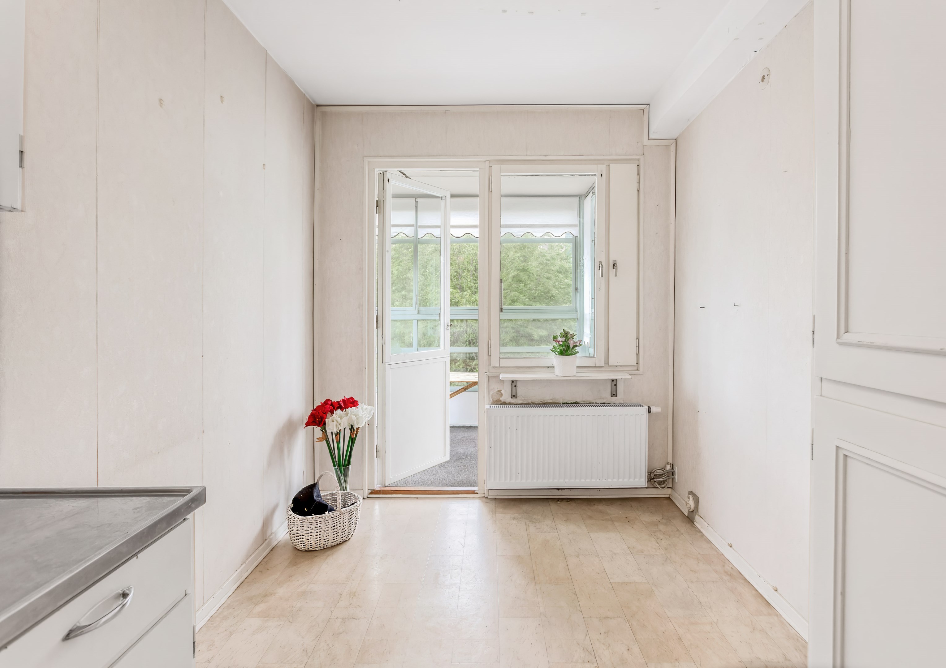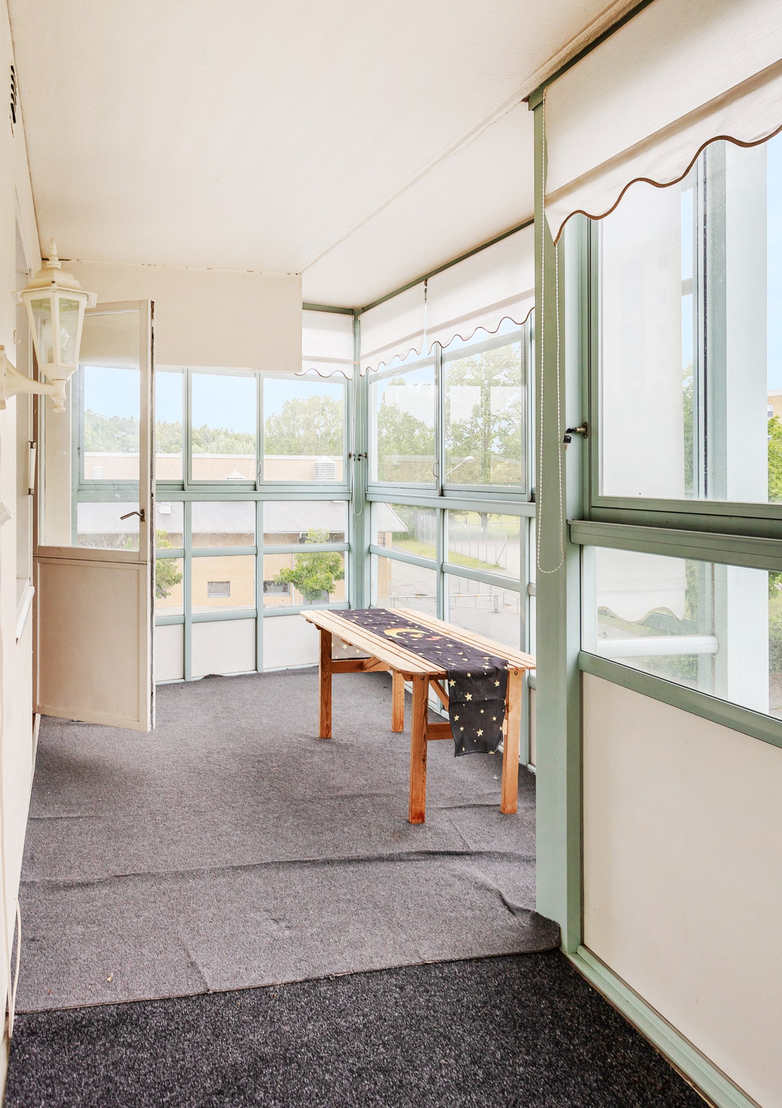 Genomgående bostad med trevlig utsikt mot grönområde! Rymligt kök med utgång till stor inglasad balkong som vetter mot söder! Gäst toalett finns! Bekväm fastighet med hissen från markplan! Välkomna!