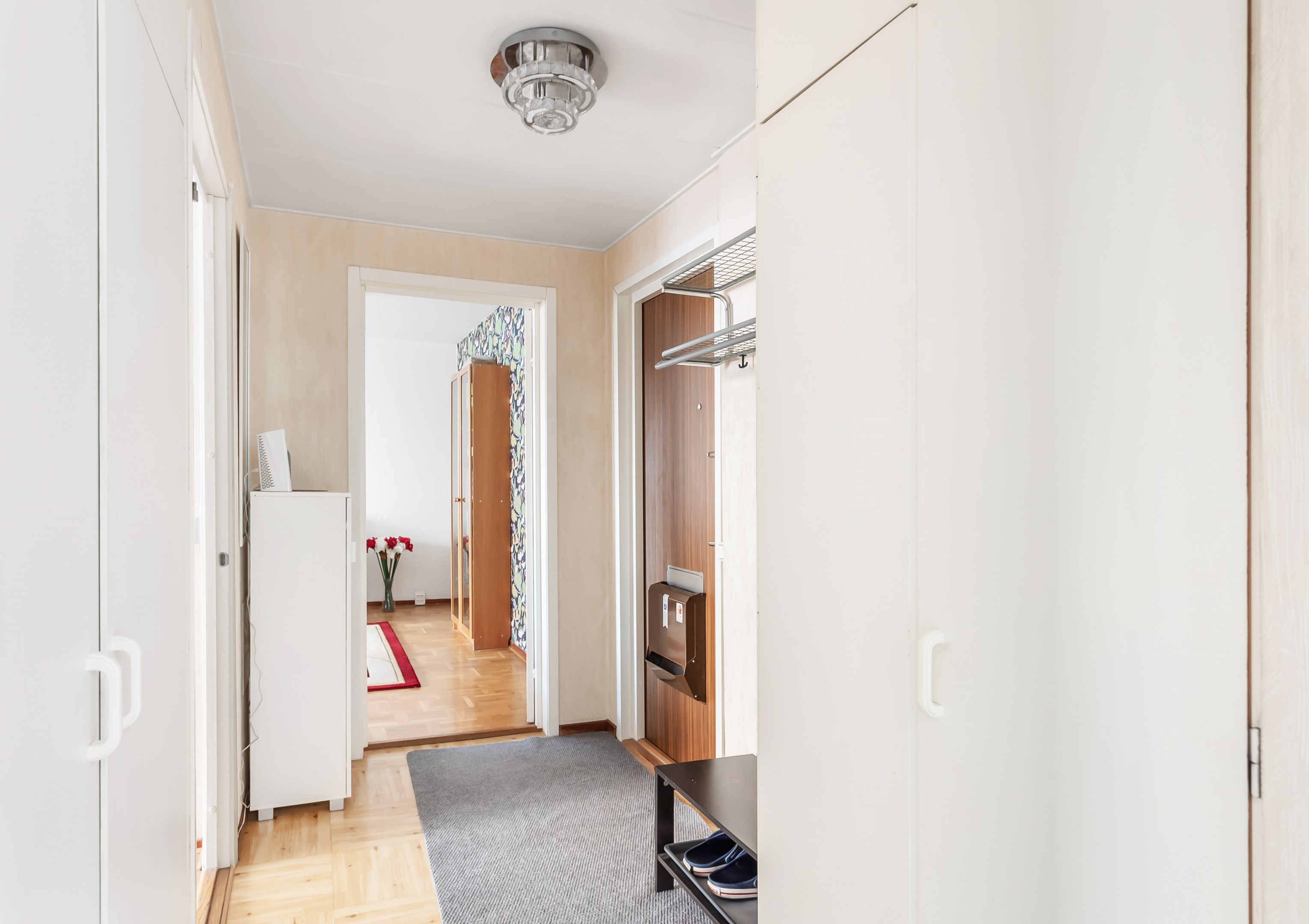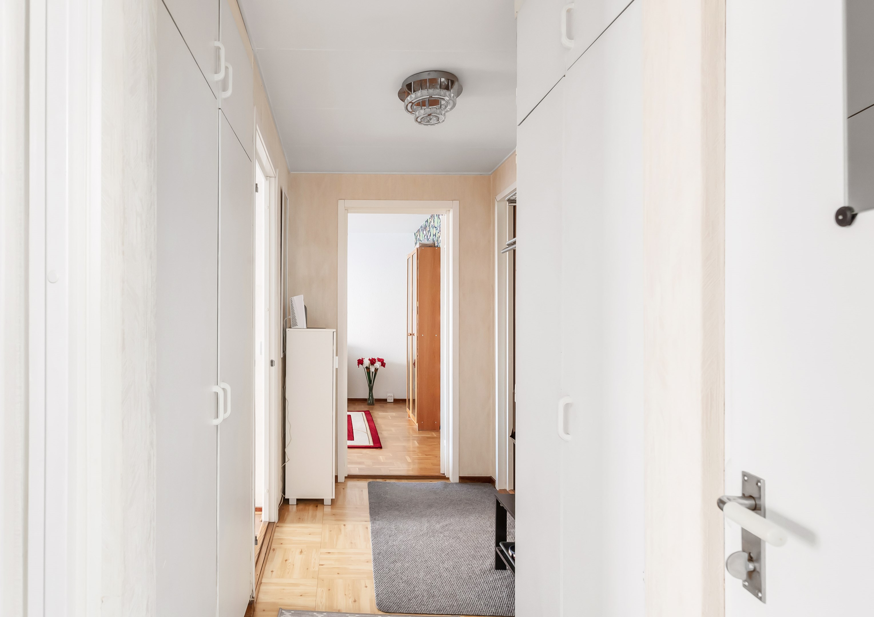 Bekvämt och trivsamt, på tredje våningen ligger denna ljusa tvårummare där kvadratmetrarna efter omsorgsfull planering utnyttjats fullt ut. Hiss finns. Välkomnande hall med ljusa tapeter på väggarna. På golvet ligger praktisk plastmatta. Stort och fräscht badrum i eleganta kulörer. Badkar, handfat, badrumsskåp och Wc. Ljust kök med matplats och god skåpsförvaring. Tapet och plastmatta. Kombinerad kyl/frys och spis. Gott om arbetsyta för matlagnings glada! Utgång till balkong. Sovrummet är rymligt och här finns det gott om plats för dubbelsäng. "Walk-in" klädkammare ståt till förfogande! Väggarna är ljusa och på golvet ligger stavparkett. Utgång till balkong även här! Stort fönster i sällskapsrummet ut mot balkongen skänker ett vackert ljus. Sällskapsrummet erbjuder plats för såväl sittgruppen som ett trivselskapande möblemang. Golvet är i fin ekparkett och här är väggarna i ljusa toner. Härifrån tar vi oss vidare ut på den stora inglasade balkongen med skön eftermiddagssol. Varmt välkomna på visning!